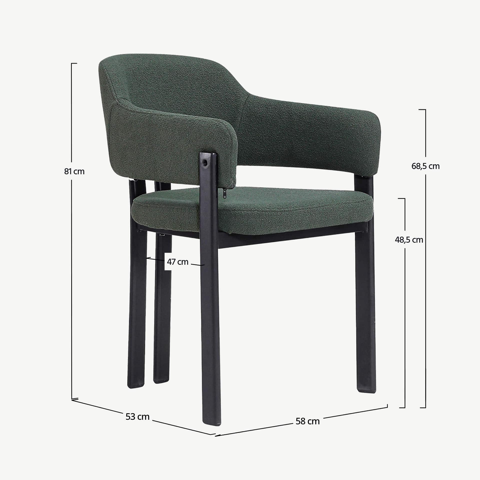 – Dark green bouclé upholstery adds texture and a premium feel
