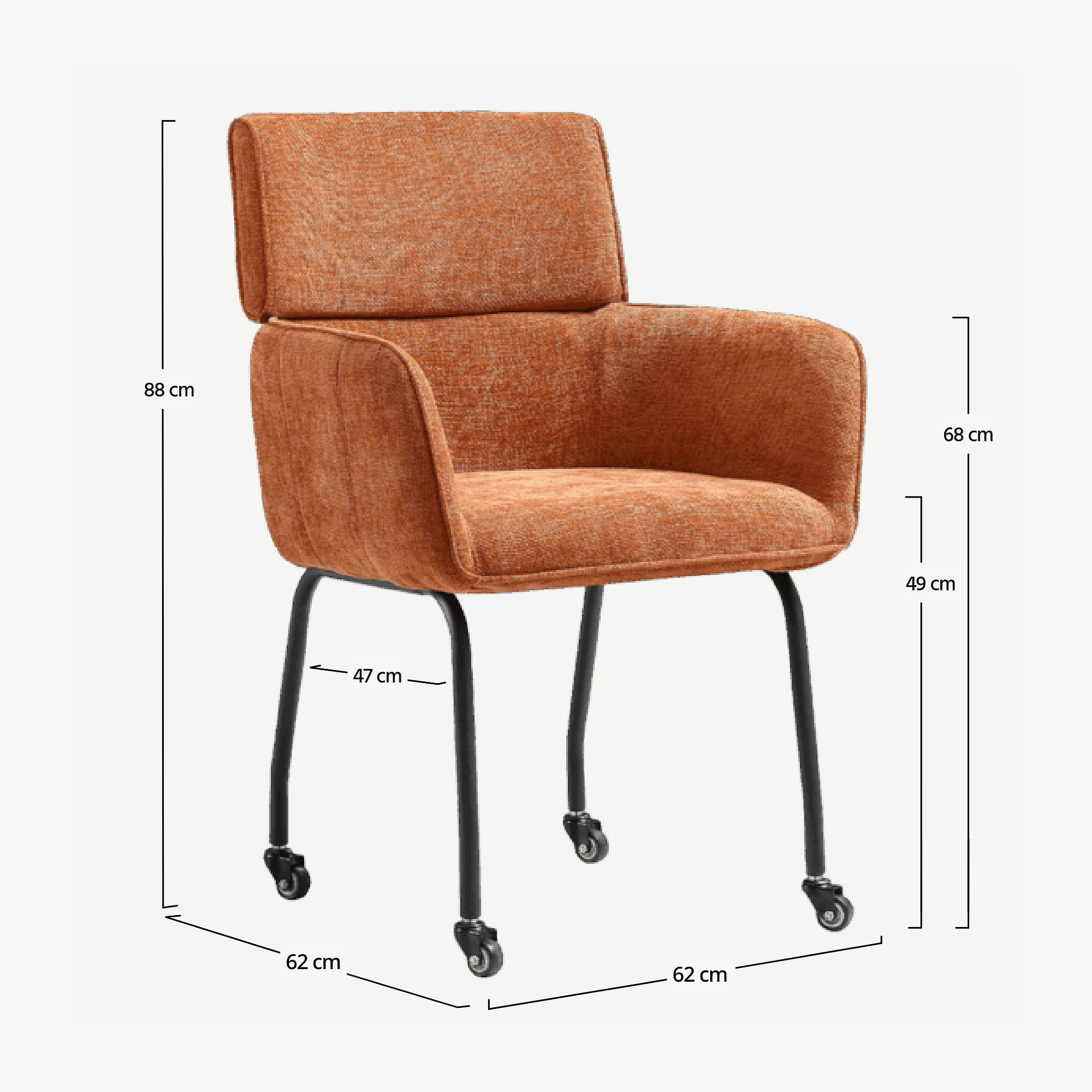 The terracotta chenille upholstery adds softness and depth, bringing a warm, welcoming tone to your interior. Combined with the chair’s clean silhouette, supportive armrests and black frame, Modar fits beautifully in contemporary dining rooms, kitchen spaces and stylish hospitality settings.